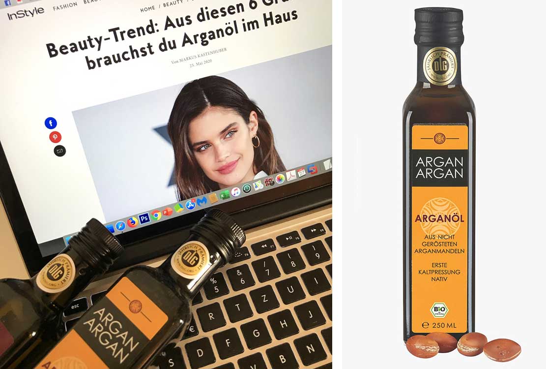 Das aus handverlesenen, nicht gerösteten Arganmandeln schonend gepresste Arganöl kann sowohl als Speiseöl als auch als hochwirksames Pflegeöl für die Haut und die Haare verwendet werden. Das Öl besitzt ungewöhnlich viele gesundheitsfördernde, pflegende und heilende Wirkstoffe. Wissenschaftler haben festgestellt, dass Arganöl die freien Radikale bindet, die zur Zellalterung beitragen. Als Hautöl kann es helfen Falten zu glätten und Krähenfüsse zu beseitigen.