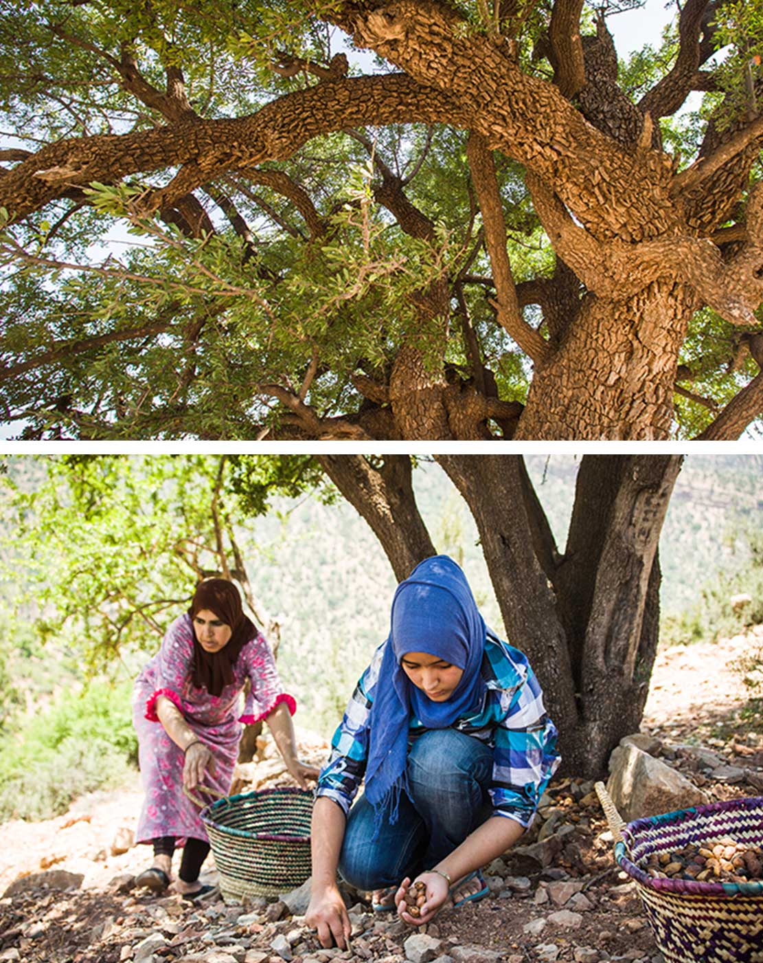 Anders als bei der Ernte von Oliven werden Arganbäume nicht geschüttelt, um an die Früchte zu kommen. Bei einem zum Teil gleichzeitigen Bestand an Blüten und Früchten würden die zarten Blüten abfallen und damit die nächste Ernte gefährden. In die dornigen Zweige zu steigen und im Baum zu ernten geht wegen der dornigen Äste auch nicht. Das Herunterschlagen der Früchte mit Stangen würde den Baum beschädigen.