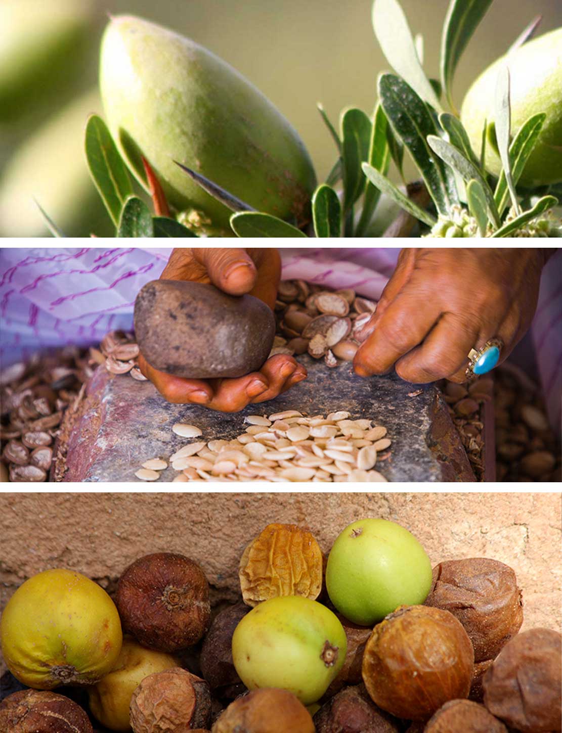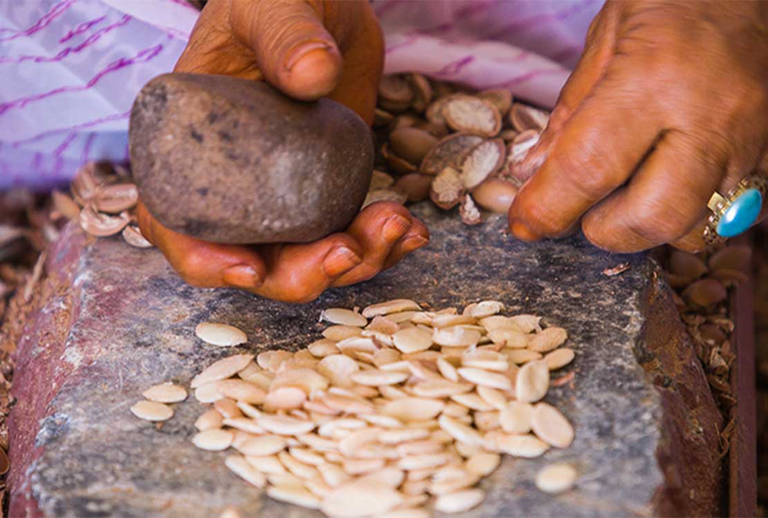 Die extrem harten Kerne der Arganfrucht werden mit einem Steinkeil sorgfältig aufgeschlagen, um an die zwei bis drei zarten Arganmandeln zu gelangen. Beim Aufschlagen achten die Frauen, dass sie den Schlag auf die helle Argannaht setzen, um die Mandeln nicht zu verletzen.
