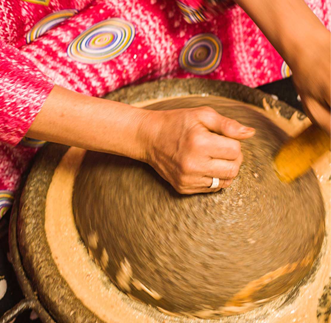 Das Mahlen und Pressen der Arganmandeln in der traditionellen Herstellung