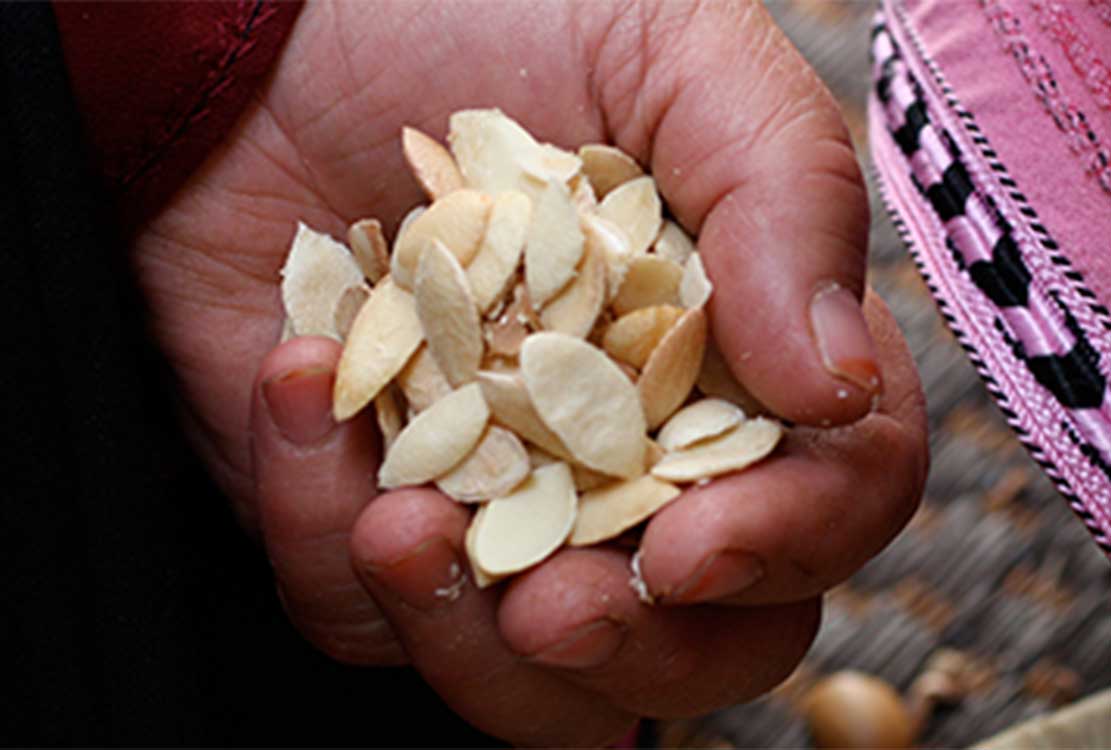 Die kleinen freigelegten Arganmandeln sind etwa so groß wie Sonnenblumenkerne. Sie werden von ihrer dünnen Haut befreit und noch einmal gründlich gereinigt und nach Reinheit und Zustand ausgelesen. Aus den 30 Kilogramm Argankernen können schließlich nur rund 3 Kilogramm Arganmandeln entnommen werden.