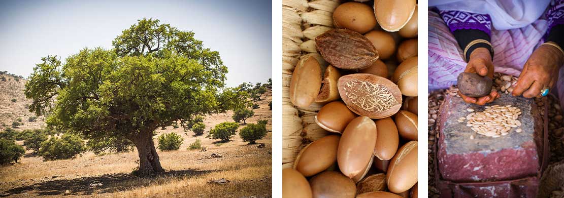 In einem Lehmhaus saßen Berberinnen im Kreis auf Ziegenwollteppichen, fröhlich singend produzierten sie das kostbare Arganöl von Hand wie seit Jahrhunderten. Mit flinken Fingern und einem Steinkeil wurden die harten Kerne der Arganfrucht aufgeschlagen, um an die kleinen Arganmandeln zu kommen. Die Mandeln wurden am Holzkohlefeuer geröstet (das gibt den fein-nussigen Geschmack des Speiseöls) und wanderten in das Loch von Steinmühlen, wo sie mühsam von Hand zu einem Mandelteig gemahlen wurden. Durch minutenlanges Kneten wurde das wertvolle Öl aus dem braunen Teig herausgearbeitet und Tropfen für Tropfen in Tonschalen aufgefangen. So also wurde das mystische Arganöl seit fast 800 Jahren von marokkanischen Berberfrauen Arganöl hergestellt.